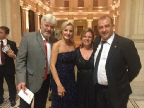 Luiz Carlos Bevilacqua, empresário e rotariano do RC Guarujá, foi eleito o Presidente da Casa da Visão do Guarujá para a gestão 2014-2015. A Casa da Visão é um projeto idealizado pelo Rotary Club do Guarujá e está sendo executado com parceria do Guarujá Golf Clube e Prefeitura do Guarujá. O projeto prevê a construção de prédio de 150 m², em terreno de 1.600m2, cedido pela Prefeitura Municipal do Guarujá, já em fase final de implantação. Irá fornecer gratuitamente a cegos e deficientes visuais graves exames, tratamentos, óculos, lentes e orientação para independência e integração social. Na foto, da direita para a esquerda, Luiz Carlos e sua esposa Késia e Carlos Henrique Christianin, Presidente do Club, gestão 2014-2015, e sua esposa Elaine..